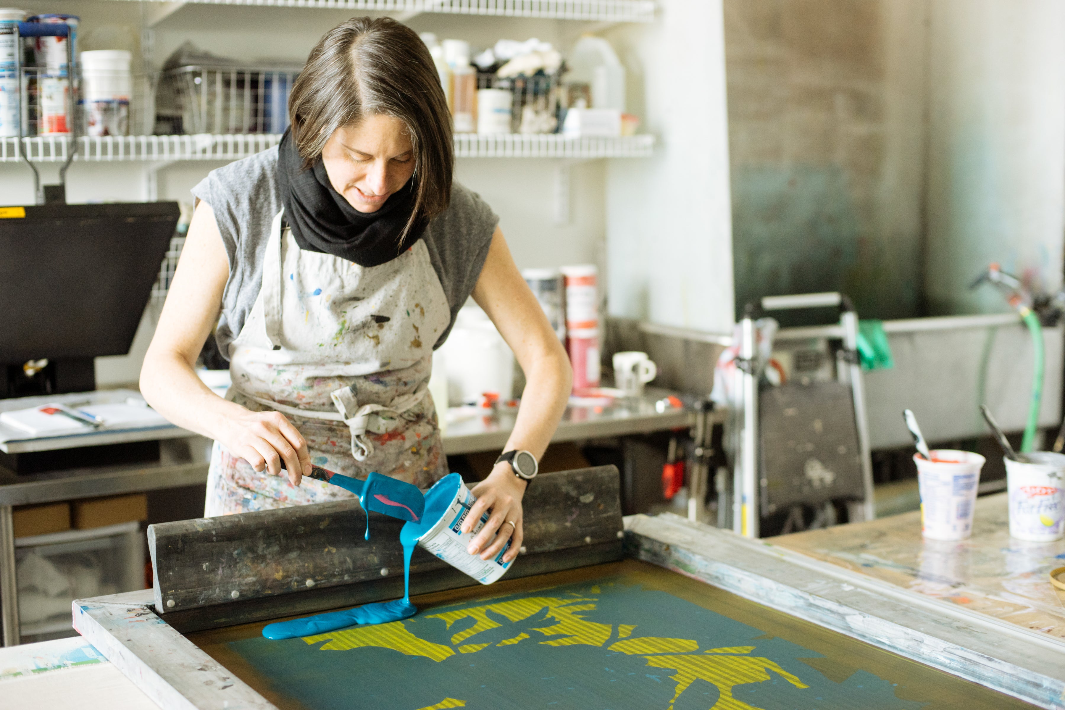 Printing on fabric is achieved by moving pigment across the screen, back and forth from lead to assistant printer, using a squeegee. The method used is rooted in a long-standing tradition of hand printing textiles.